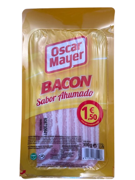 InicioFrescosBacon lonchas Oscar Mayer 100grBacon lonchas Oscar Mayer 100gr Bacon lonchas Oscar Mayer 100gr cantidad Inicia sesión antes SKU: 912987 Categoría: Frescos Product ID: 4577 Productos relacionados 4 Quesos rallado 1KG Inicia sesión antes Panceta adobada dmaria €/kg Al ser un producto de peso variable se…Inicia sesión antes Mozzarella rallada 2KG Inicia sesión antes
